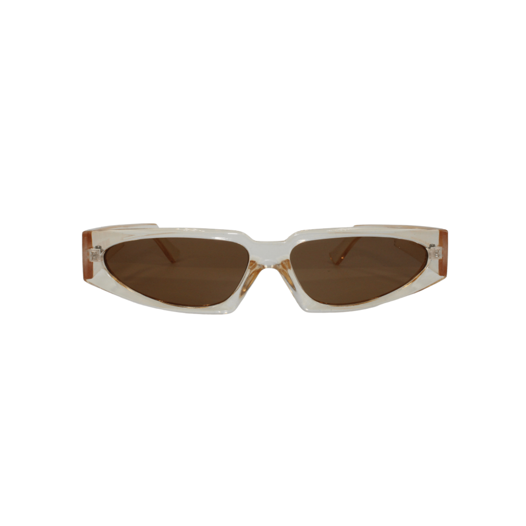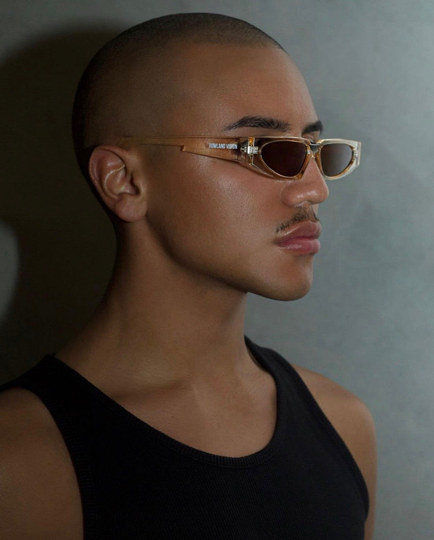 CAITLIN IS FROM OUR THIRD DROP 'VISION THREE' IS DEFINED BY IT'S THICK TRANSPARENT FRAME, BROWN TINTED LENS & TRANSPARENT TEMPLE (ARM).