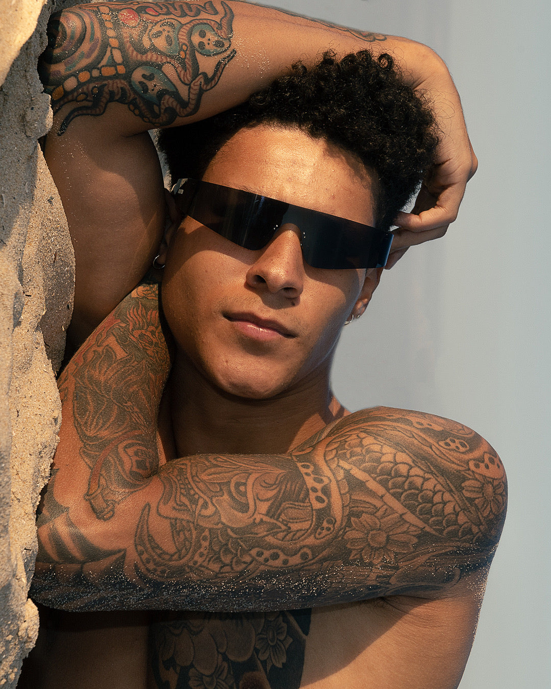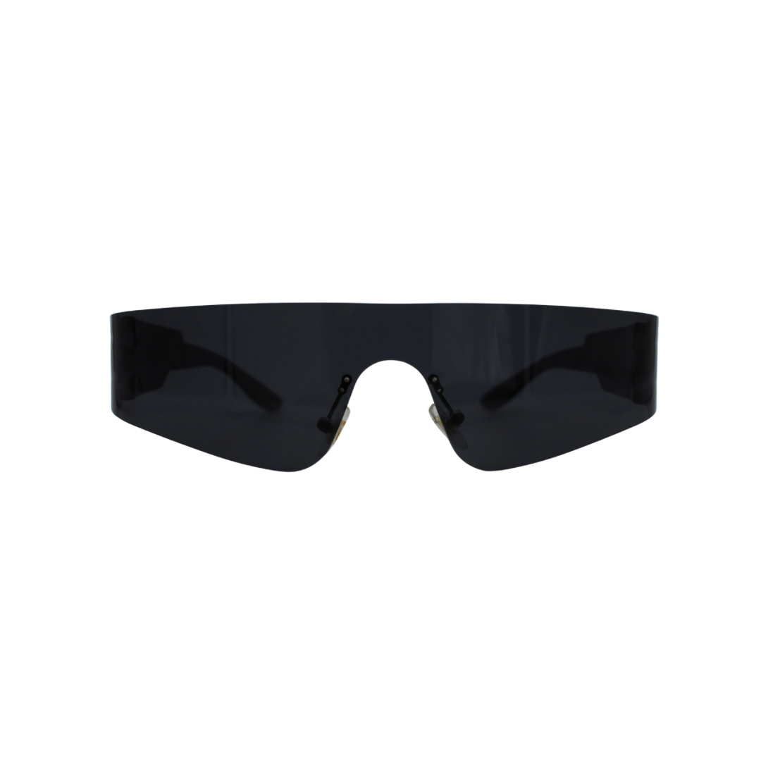 DEFINED BY IT'S LIGHTWEIGHT BLACK RIMLESS FRAME, RIMLESS BLACK MIRRORED LENS & TRANSPARENT BLACK TEMPLE (ARM).
